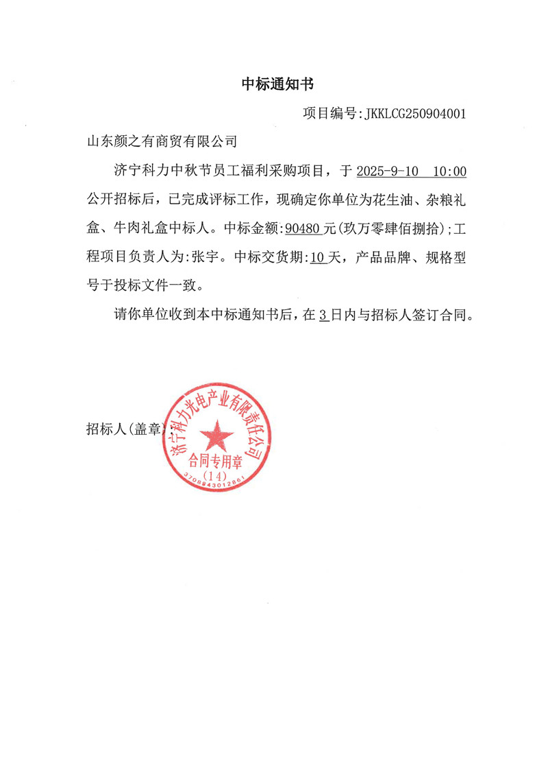 2025年济宁科力中秋节员工福利采购项目中标通知书