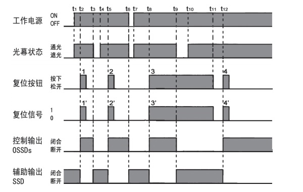 有效复位:每次按下复位按钮,R1、R2接通一次,在控制器内部产生一个由0V至24VDC的跳变上升沿。此时,如果光幕处于通光状态,控制器的控制输出、辅助输出、状态指示灯立即响应,进入“正常”状态。光电保护装置的电启动、重启动、光幕遮光后恢复通光,控制输出OSSD1、OSSD2、OSSD3均保持断开状态,SSD保持闭合状态:当且仅当经过一次有效复位,控制输出进入闭合状态,辅助输出进入断开状态。