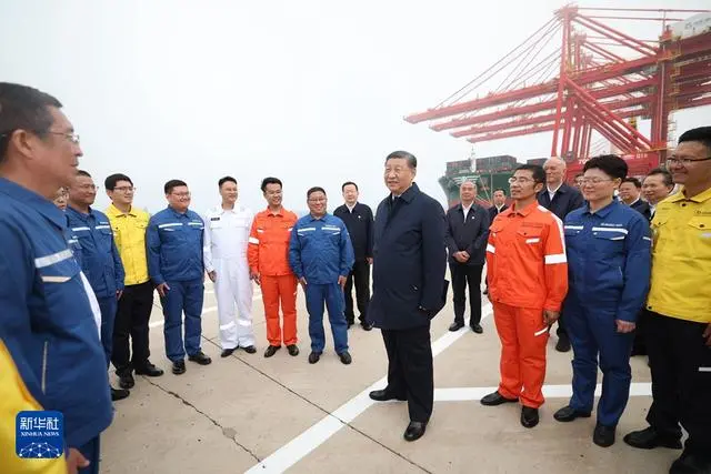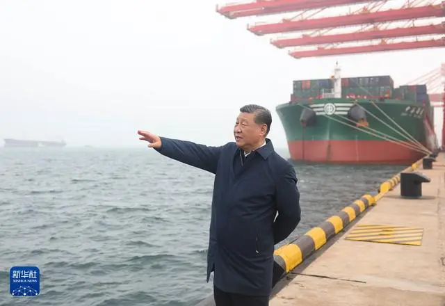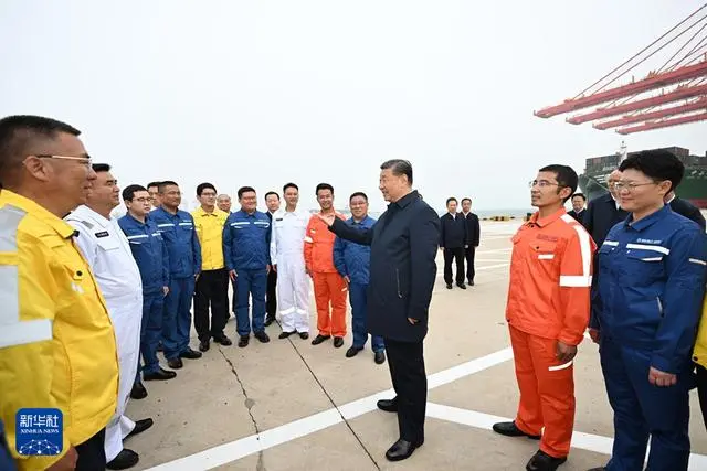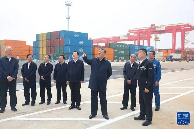 22日下午,习近平首先来到日照港考察。日照港是重要的能源和大宗原材料中转基地,近年来推进智慧化、绿色化建设,建成顺岸开放式全自动化集装箱码头。习近平听取山东省港口发展建设和日照港规划布局等情况介绍,并察看全自动化集装箱码头作业场景。他说,日照港是改革开放后新建的港口,近年来推进科技创新,将传统港口改造升级为现代化港口,不仅货物吞吐量跻身全国前列,还积累了通过传统产业改造升级发展新质生产力的经验,值得肯定。习近平亲切慰问港口科技工作者、运营人员、航运人员,希望大家再接再厉、继续奋斗,推动日照港管理运营更上一层楼。