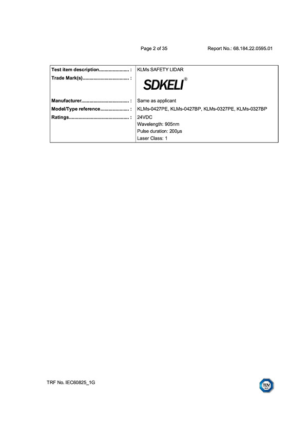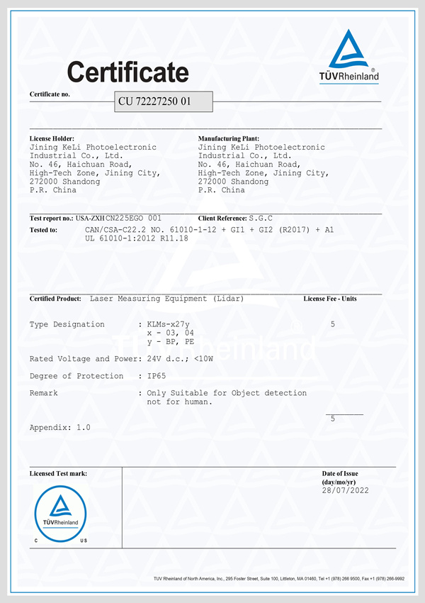 KLMs激光雷达-TUV mark证书2