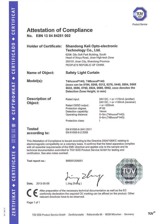 T4型安全光幕-CE(EMC)证书
