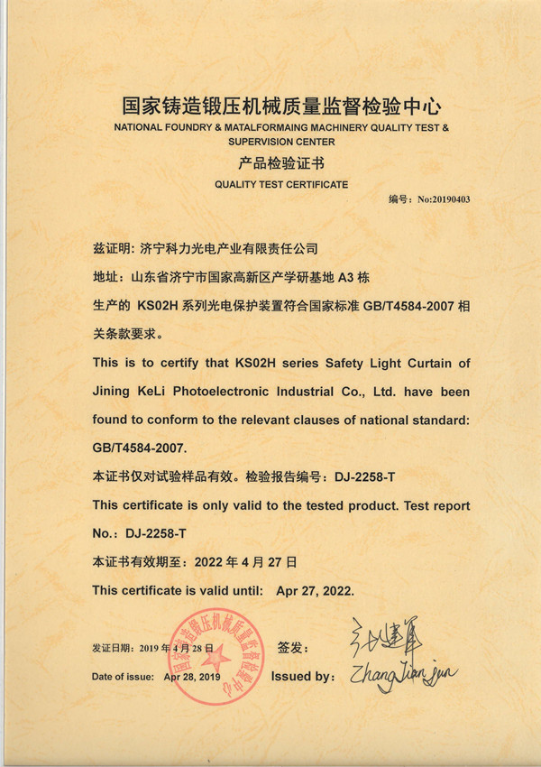 KS02型光电保护装置检验证书