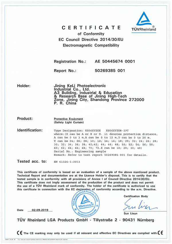 KS06安全光幕-EMC证书