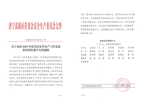 2015年,济宁高新区各街道、各部门、各企事业单位按照党工委、管委会的安排部署,以科学发展观统领全局,坚持安全发展理念,紧紧围绕“大排查快整治严执法”集中行动,以强化企业安全生产主体为重点,深化隐患排查治理和专项整治,严厉打击各类非法违法生产经营建设行为,取得了明显成效,为经济和社会事业发展创造了安全稳定的环境。为表彰先进,安委会发文授予科力光电公司等16家企业“安全生产先进企业”荣誉称号。