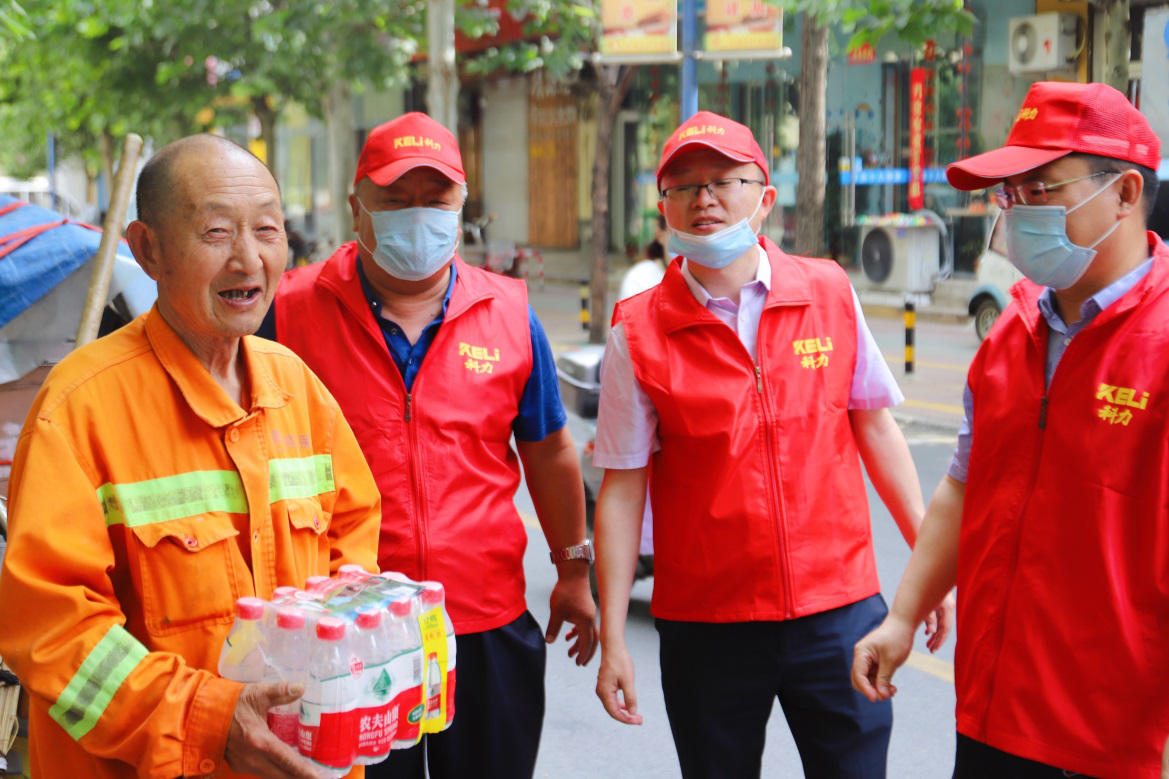 看到勤奋的环卫工人们在高温下仍然努力地辛苦劳动,志愿者们贴心地送上了矿泉水,向他们表达慰问和敬意。