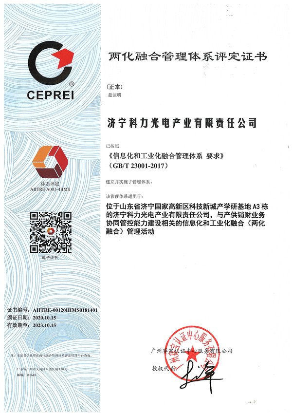 济宁科力光电产业有限责任公司按照《信息化和工业化融合管理体系 要求》(GB/T 23001-2017)建立并实施管理体系,荣获两化融合管理体系评定证书;