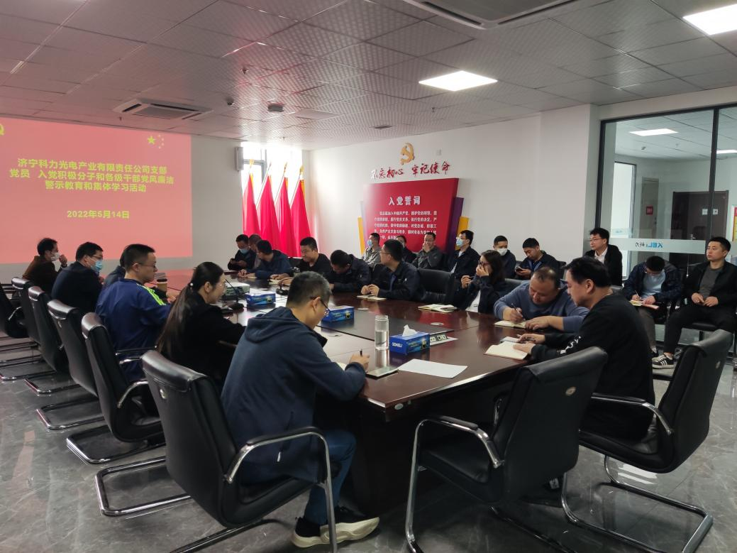 2022年5月14日上午,济宁科力光电产业有限责任公司党支部组织全体党员、入党积极分子和各级管理干部,开展了集中学习和党风廉洁警示教育活动。大家首先学习了习近平《在庆祝“五一”国际劳动节暨表彰全国劳动模范和先进工作者大会上的讲话》,然后观看学习了党风廉政建设警示教育片—《零容忍 第4集:系统施治》。
