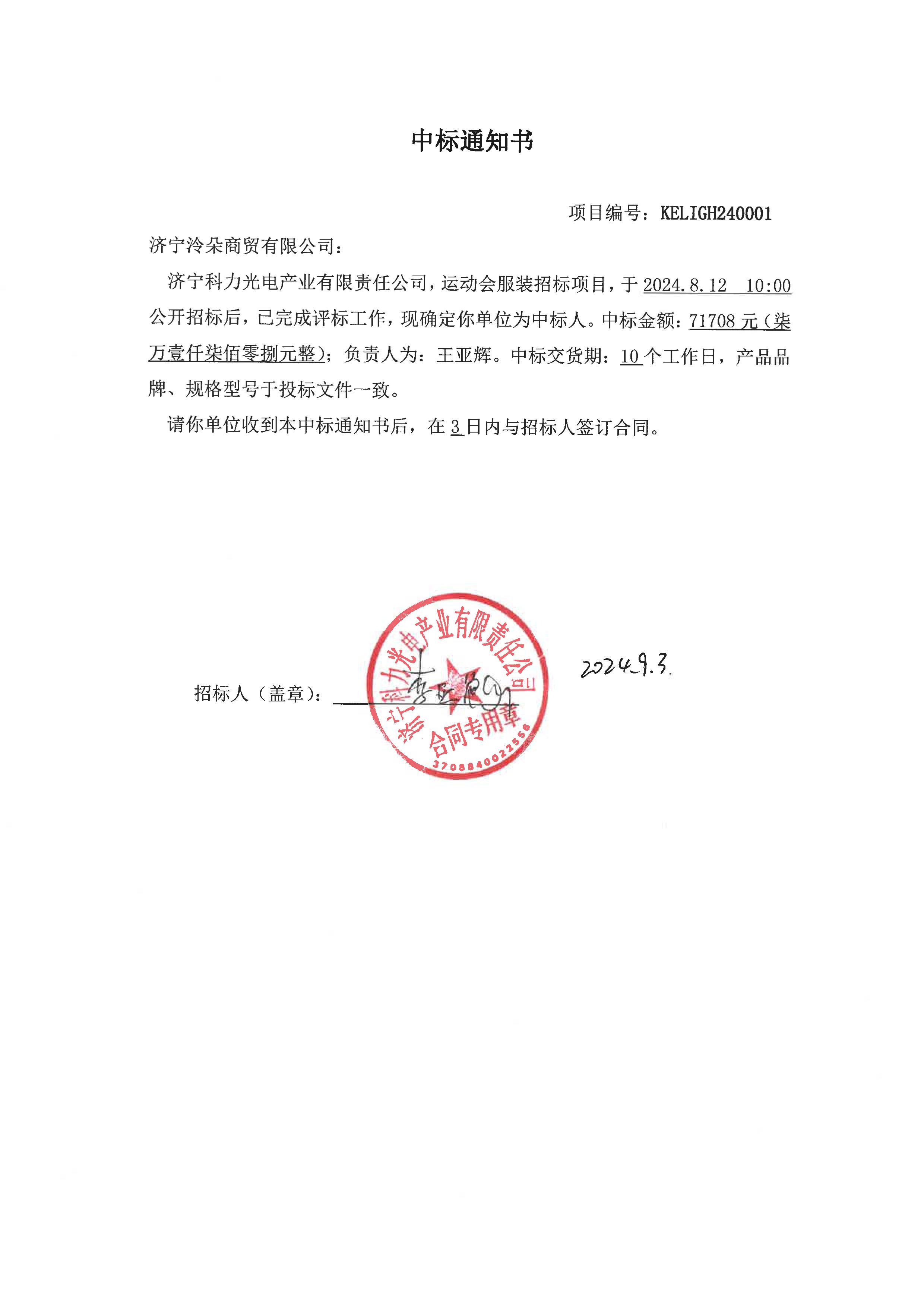 济宁科力光电运动会服装采购项目中标通知书